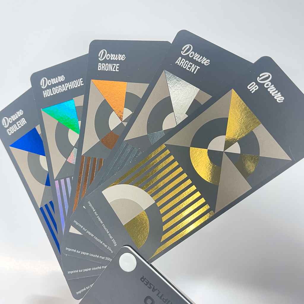 - Dorure (or, argent, cuivre, holographique, rouge) : idéal pour donner un côté luxueux et prestigieux à votre flyer, en attirant l’œil sur des détails.